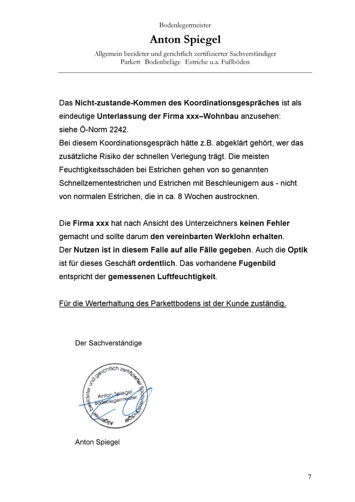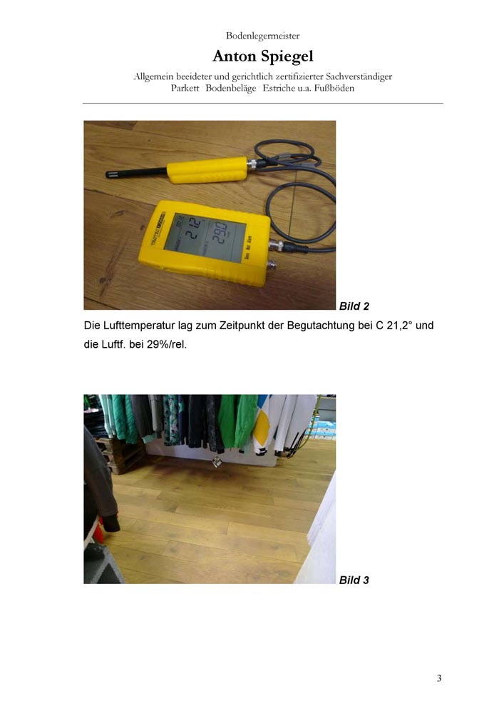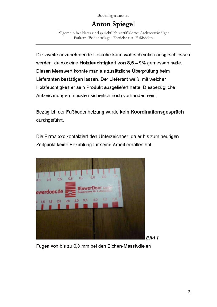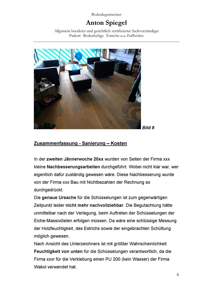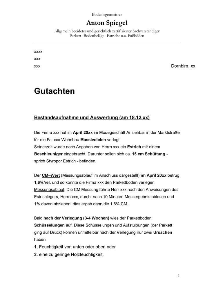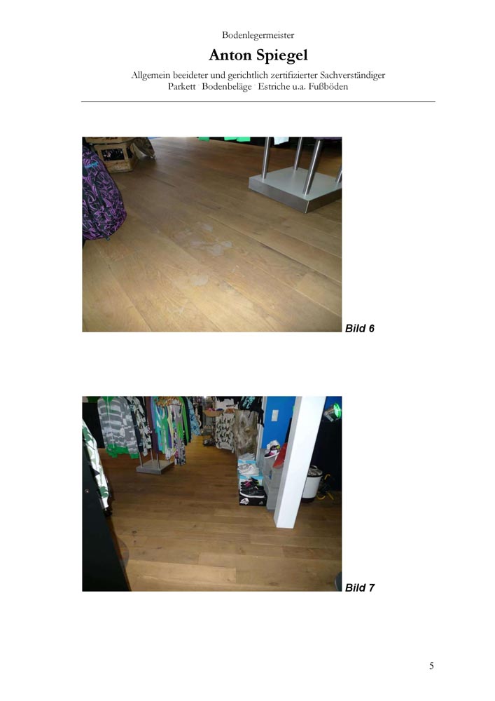 Die Firma xxx hat im April 20xx im Modegeschäft Anziehbar in der Marktstraße für die Fa. xxx-Wohnbau Massivdielen verlegt. Seinerzeit wurde nach Angaben von Herrn xxx ein Estrich mit einem Beschleuniger eingebracht. Darunter sollen sich ca. 15 cm Schüttung – sprich Styropor Estrich – befinden.